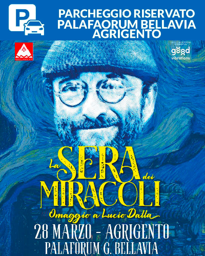 Parcheggio Palaforum Bellavia - La Sera Dei Miracoli - Omaggio a Lucio Dallasabato 28 mar 2026, 18:00Parcheggio Palaforum G. Bellavia - Sport Village, AgrigentoTicketzeta exclusiveQuesti biglietti sono in vendita solo su TicketzetaSeleziona i tuoi bigliettiParcheggio / Parcheggio auto Attenzione: non è possibile introdurre camper, furgoni, bus e roulotte di qualsiasi dimensione4.00€ + CommissioniParcheggio / Parcheggio moto2.00€ + CommissioniModalità di consegnaTicket@Home (Stampa a casa i tuoi biglietti in autonomia) GratisWhatsApp Ticket (Ricevi i tuoi biglietti direttamente su WhatsApp, disponibili anche offline senza connessione) 0.50 €Ticketzeta non è l'organizzatore dell'evento ma si occupa della vendita e distribuzione dei titoli d'accesso per conto dell'organizzatore. L'organizzatore è:FONDAZIONE TEATRO VALLE DEI TEMPLIVenueParcheggio Palaforum G. Bellavia - Sport VillageC.da Esa Chimento, SNCAgrigento, AGInfo bigliettiIl numero massimo di biglietti acquistabili è: 10Rivendita: Non disponibileCambio nominativo: Non disponibilePer esigenze organizzative, le date di chiusura rivendita e cambio nome, potrebbero variare.Vantaggi TicketzetaBiglietti verificatiAcquisto sicuro e protettoFan Box con corriere espressoBiglietto digitale con WhatsAppPersone con disabilitàLe richieste di accesso per le persone con disabilità sono gestite direttamente dall'organizzatore dell'evento. Per maggiori info clicca qui.A partire da 2.00 € Al tuo ordine verranno applicate commissioni. Per conoscere la composizione del prezzo del tuo biglietto clicca qui.Biglietti Dettaglio prezziPrezzi indicati come tutti gli operatori del mercatoBigliettoPrezzoPrevenditaCommissioniParcheggio / Parcheggio auto4.00 €0.00 €0.48 €Parcheggio / Parcheggio moto2.00 €0.00 €0.24 € Spese di spedizioneLe spedizioni tramite il nostro corriere sono tracciate. Riceverai il numero di tracking una volta spediti i tuoi biglietti.ZonaPrezzo