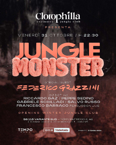In high demandJungle Monster - Federico GrazziniFriday 31 Oct 2025, 22:30Clorophilla Winter, Porto EmpedocleHalloween SelectionI migliori eventi di halloween su Ticketzeta